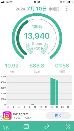 2024年7月10日のウォーキング記録 距離:10.92km 歩数:13,940歩 消費カロリー:588.8kcal 体重:66.7kg
