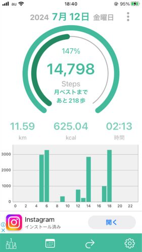2024年7月12日のウォーキング記録 距離:11.59km 歩数:14,798歩 消費カロリー:625.04kcal 体重:67.6kg