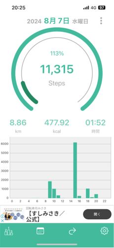 2024年8月7日ウォーキング記録 距離:8.86km 歩数:11,315歩 消費カロリー:477.92kcal 体重:66.9kg
