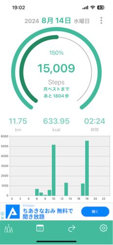 2024年8月14日のウォーキング記録 距離:11.75km 歩数:15,009歩 消費カロリー:633.95kcal 体重:68.1kg