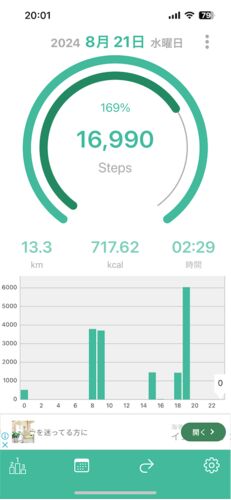 2024年8月21日のウォーキング記録 距離:13.3km 歩数:16,990歩 消費カロリー:717.62kcal 体重:67.6kg