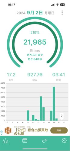 2024年9月2日のウォーキング記録 距離:17.2km 歩数:21,965歩 消費カロリー:927.76kcal 体重:64.8kg