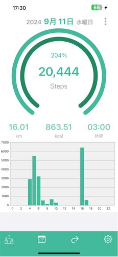 2024年9月11日のウォーキング記録 距離:16.01km 歩数:20,444歩 消費カロリー:863.51kcal 体重:63.8kg