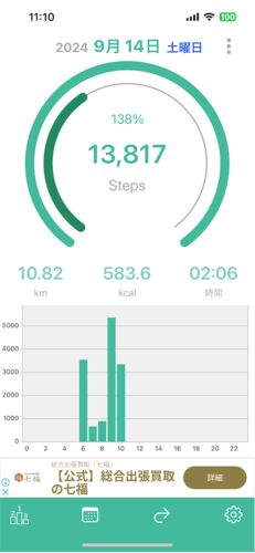 2024年9月14日のウォーキング記録 距離:10.82km 歩数:13,817歩 消費カロリー:583.6kcal 体重:63.8kg