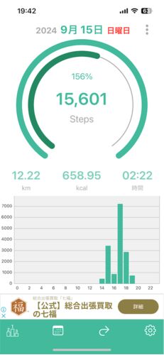 2024年9月15日のウォーキング記録 距離:12.22km 歩数:15,601歩 消費カロリー:658.95kcal 体重:64.0kg