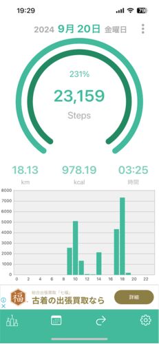 2024年9月20日のウォーキング記録 距離:18.13km 歩数:23,159歩 消費カロリー:978.19kcal 体重:64.8.kg