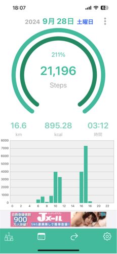 2024年9月28日のウォーキング記録 距離:16.6km 歩数:21,196歩 消化カロリー:895.28kcal 体重:63.3kg