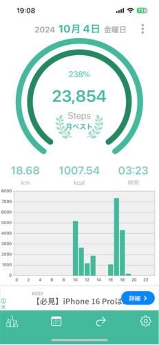 2024年10月4日のウォーキング記録 距離:18.68km 歩数:23,845歩 消費カロリー:1007.54kcal 体重:63.5kg