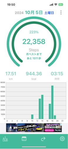 2024年10月5日のウォーキング記録 距離:17.51km 歩数:22,358歩 消費カロリー:944.36kcal 体重:63.3kg