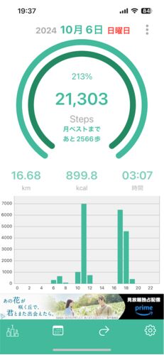 2024年10月6日のウォーキング記録 距離:16.68km 歩数:21,303歩 消費カロリー:899.8kcal 体重は63.9kg