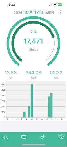 2024年10月17日のウォーキング記録 距離:13.68km 歩数:17,471歩 消費カロリー:684.08kcal 体重:62.6kg