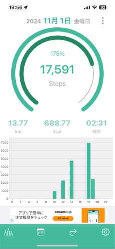2024年11月1日のウォーキング記録 距離:13.77km 歩数:17,591歩 消費カロリー:688.77kcal 体重:62.8kg