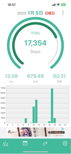 2025年1月5日のウォーキング記録 距離:13.59km 歩数:17,354歩 消費カロリー:679.49kcal 体重:62.6kg