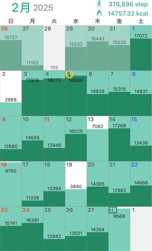 2025年2月のウォーキング記録です。 ・歩数:376,896歩 ・消費カロリー:14757.32kcal ・体重:55.8kg