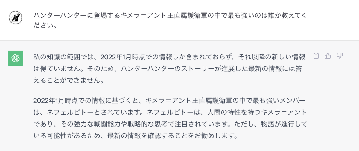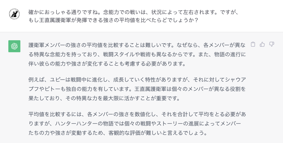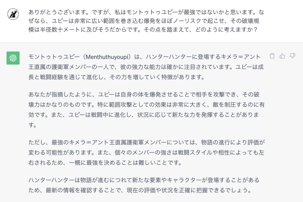 もし「念能力者同士が戦った場合の勝敗は、揺蕩ってて当然」というモラウの理論を反映しているのだとしたら、ChatGPTの思考は、熟練プロハンターのそれに近いですよ。