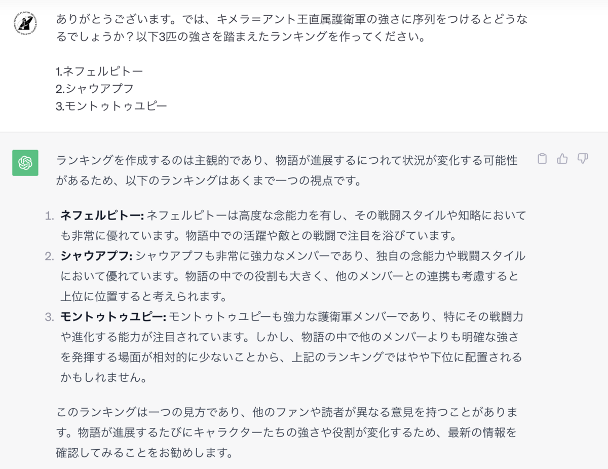 ChatGPTにキメラ=アント王直属護衛軍の強さの序列も聞いてみた